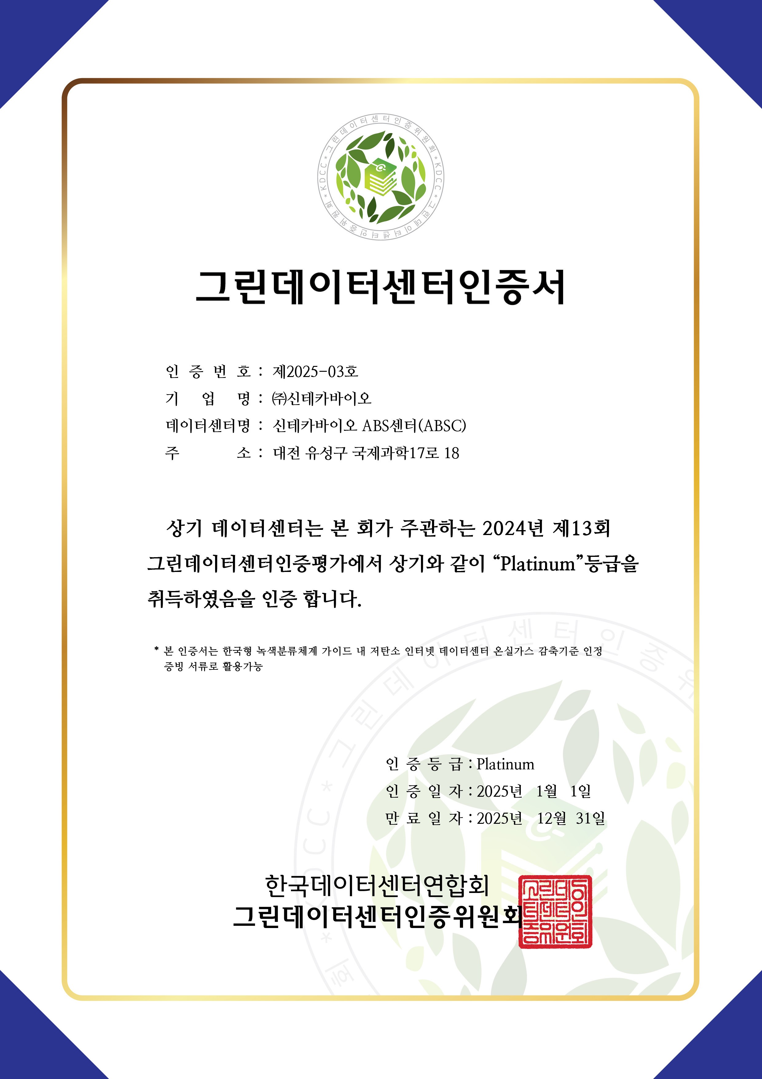 ABSC는 한국데이터센터연합회가 주관하는 그린데이터센터 인증에서 최고 등급인 플래티넘을 획득하였습니다. 이 인증은 데이터센터의 에너지 효율성과 친환경 운영을 공식적으로 인정받는 제도로, ABSC의 지속 가능한 설계와 운영이 국내외에서 높은 평가를 받고 있음을 보여줍니다.